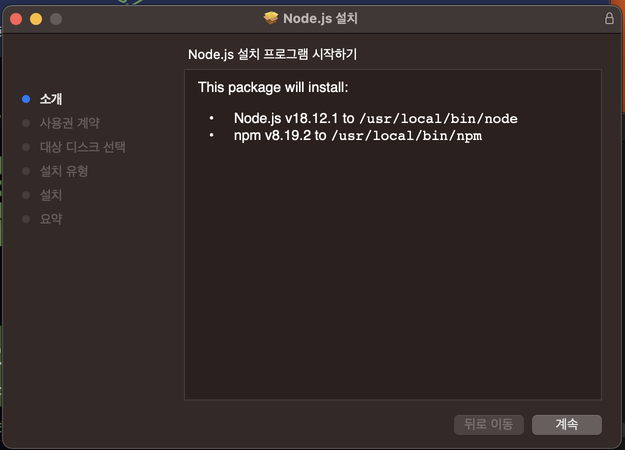 3. 다운로드 된 pkg를 실행시켜 Node.js 설치를 실행합니다.