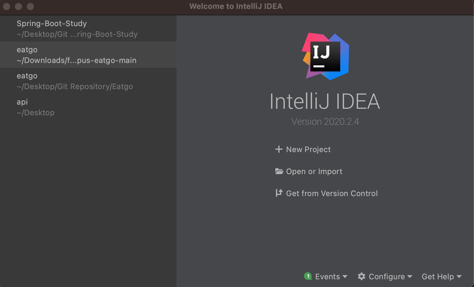 먼저 인텔리제이IDEA를 실행하고 사용자 약관 동의 등의 설정을 완료하고 나면 아래와 같은 화면을 볼 수 있습니다.