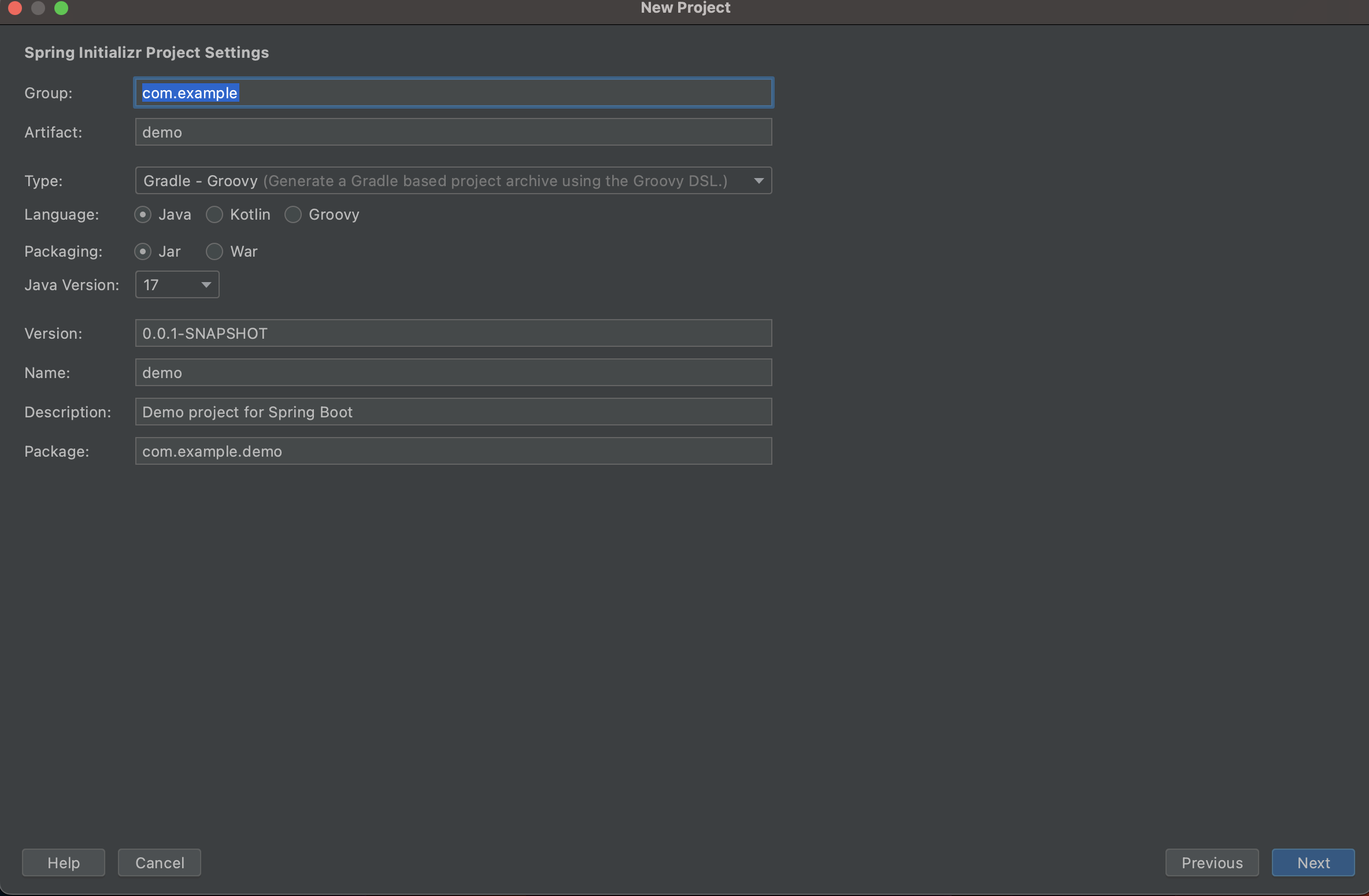 'Spring Initializr'를 선택하면 설정이 필요한 항목들이 나옵니다.