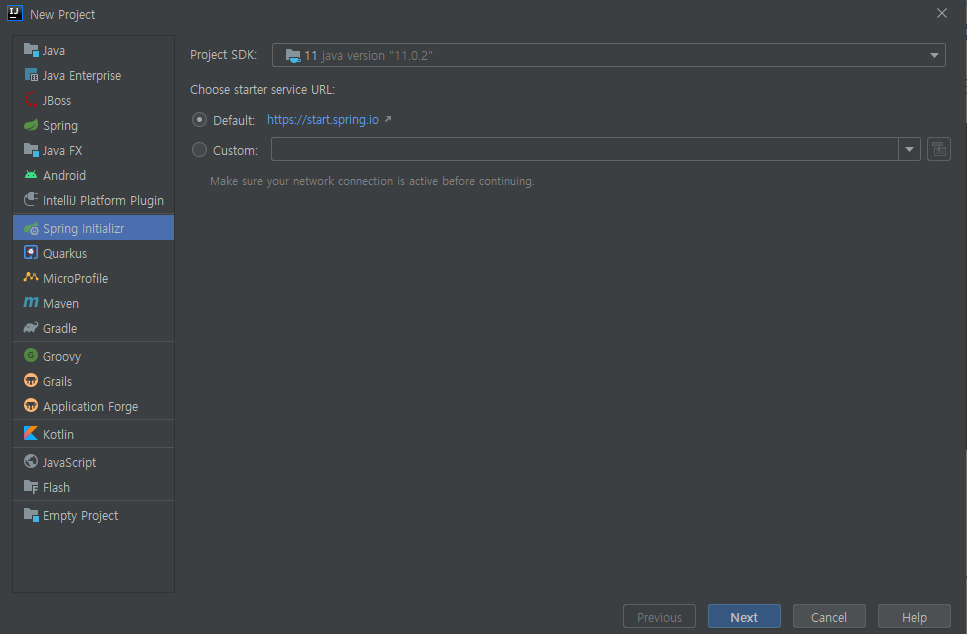 인텔리제이 IDEA는 다양한 형식의 프로젝트를 지원합니다. 그 중 사용할 것은 'Spring Initializr'입니다. 원래는 스프링 공식 사이트에서 제공하는 스프링 부트 프로젝트 생성 기능인데, 인텔리제이 IDEA에도 내쟁돼 있습니다.