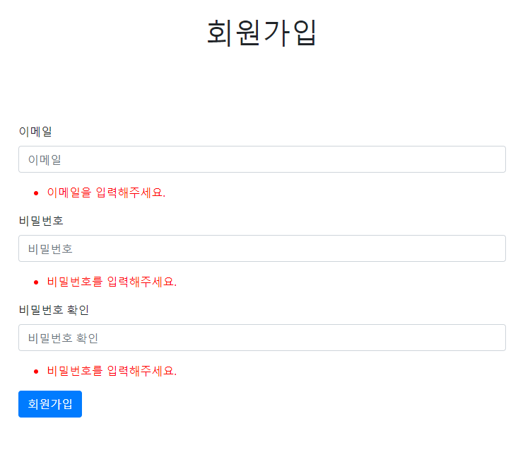 127.0.0.1:8000/register/ 주소로 들어가보시면 회원가입 페이지가 나올거에요 그리고 형식에 맞게 입혁하지 않을 경우 아래와 같이 에러 메세지 출력 되시는거 확인하실수 있으세요